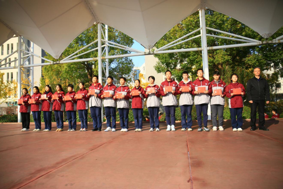 请获得表彰的高一年级学生代表们上台,请蔡欣副校长为他们颁奖。